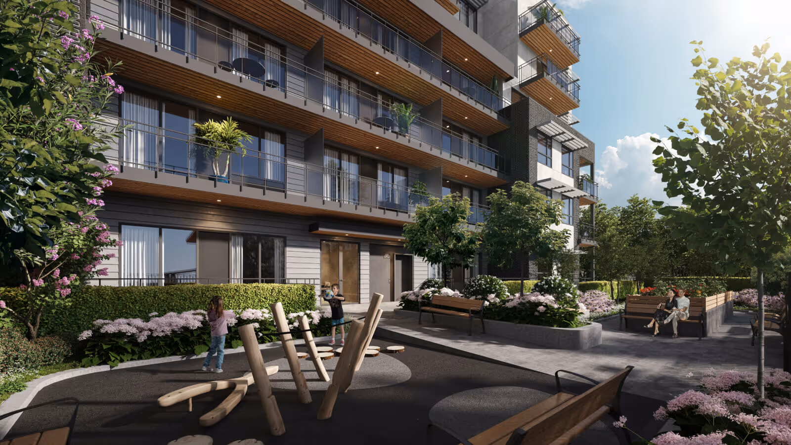 Responding to neighbourhood design guidelines, the building incorporates a stepped‑back north façade along East Broadway to enhance daylight access and support a comfortable, pedestrian‑friendly public realm. The lower storeys feature a dark charcoal brick inspired by classic brownstone townhomes, establishing a strong street presence and human‑scaled rhythm. Above, the upper levels transition to a light, panelized cladding that softens the massing and creates a subtle, sky‑facing profile.